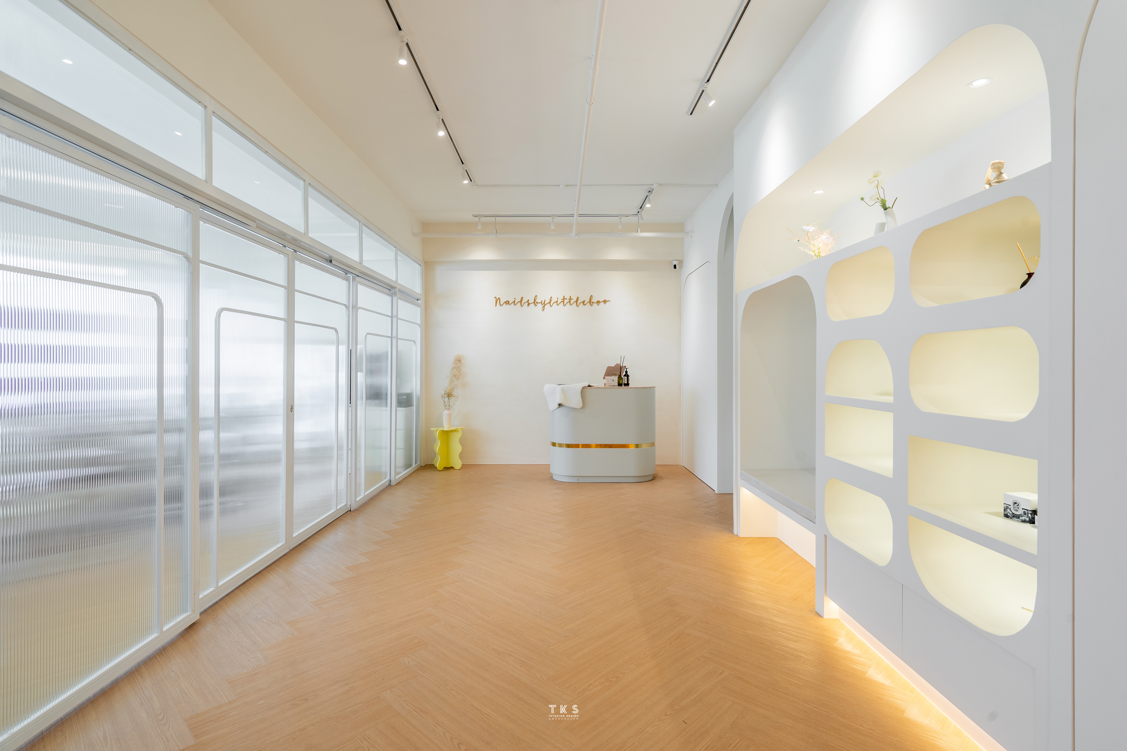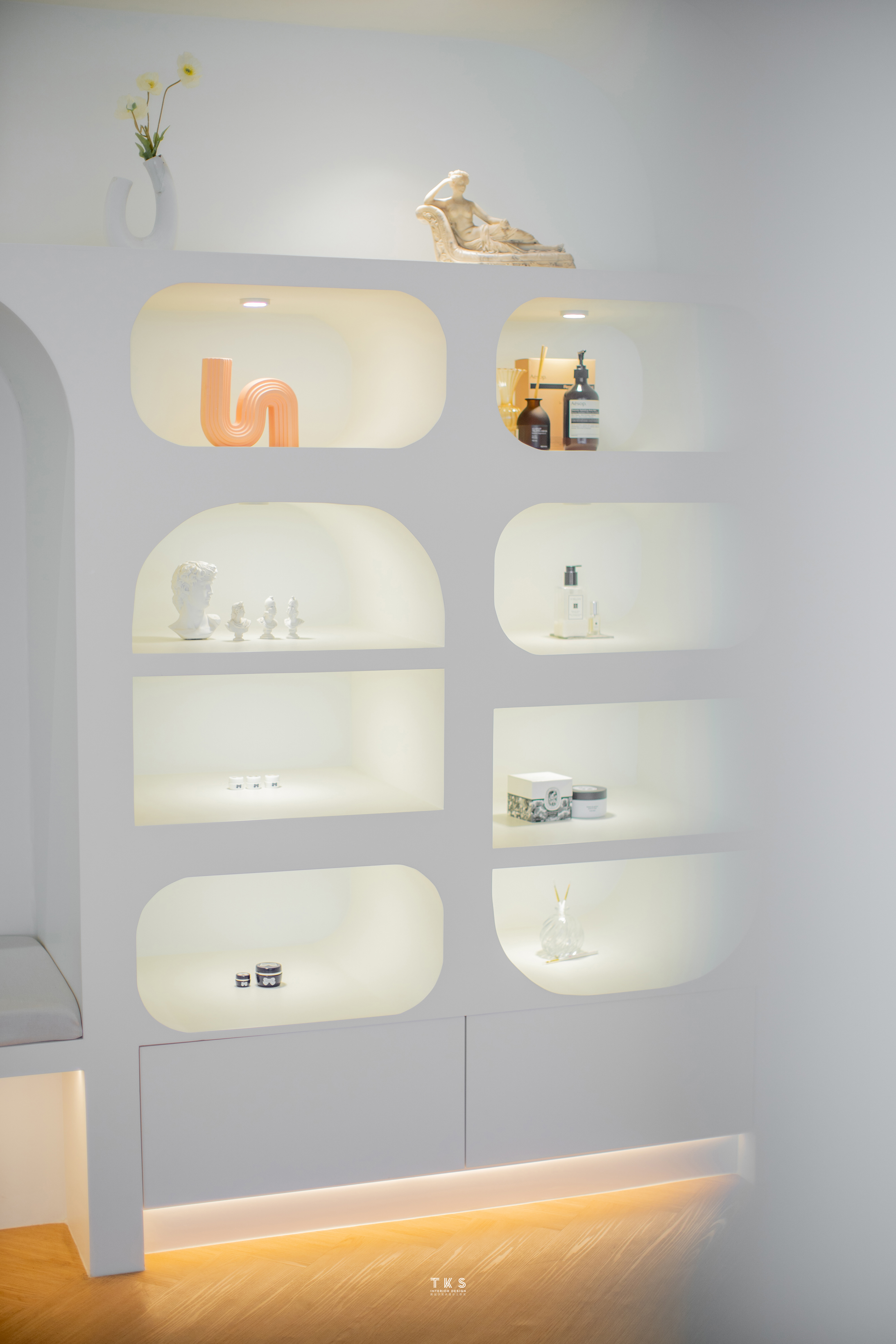 Originally comprised of only two shop lots, the client bought an extra one to expand the saloon. Its journey begins with a waiting area and manicure station flowing into the pedicure station and, finally a display space and classroom. Deliberate details were repeated throughout to evoke a cosy effect: archways swell with gentle parabolas, vinyl wood flooring is practical yet comfortable underfoot and textured wall finishings in off-white have a wabi-sabi feel. In all three units, the unsightly DB box was covered with a cabinet for a seamless visual experience and extra storage.