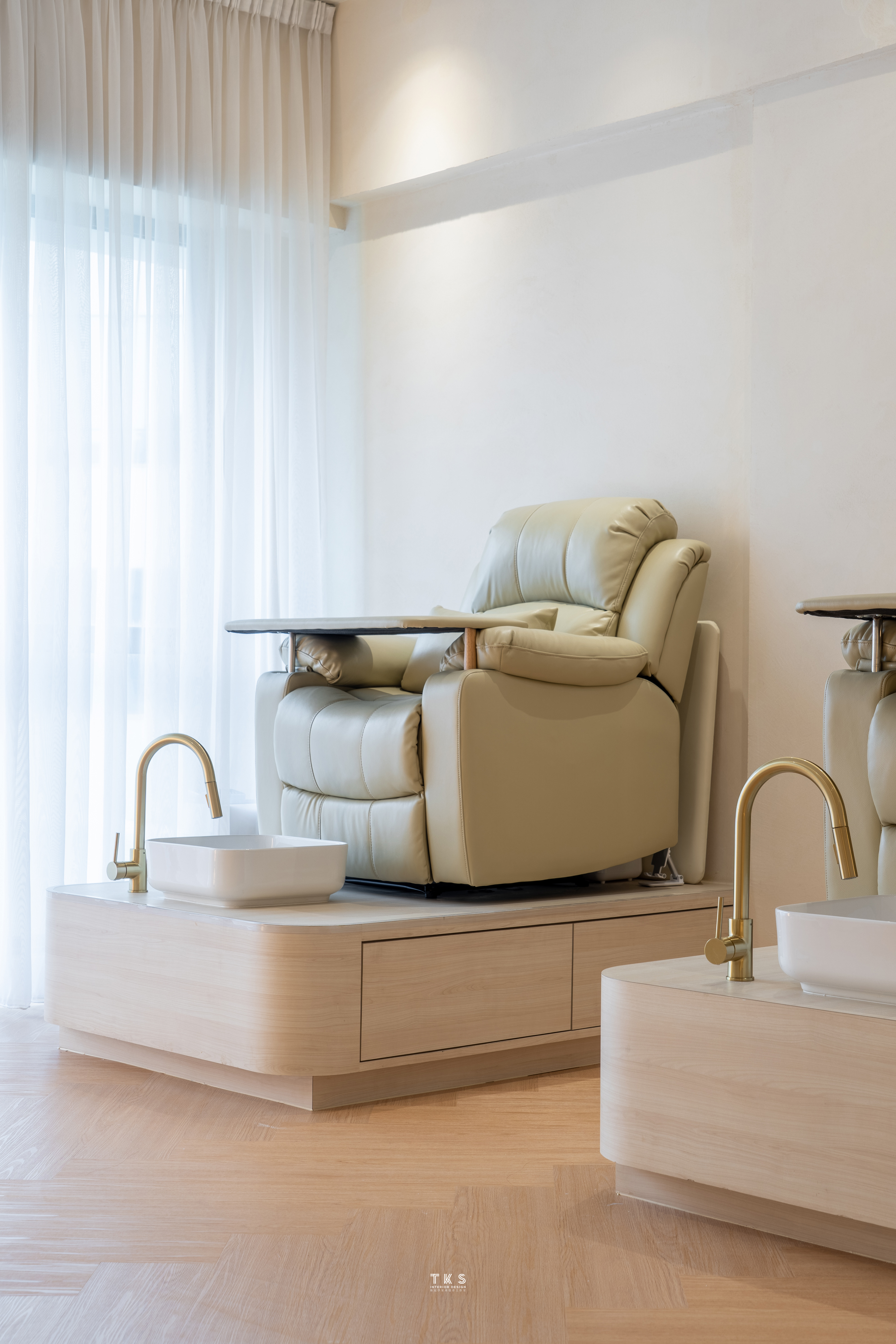 Moving onto the pedicure station, where well-stuffed chairs ensure customers are lulled into a gentle reverie while they enjoy being pampered. These chairs rest on top of uplit plinths with rounded corners similarly shaped sinks, and brass finish taps.