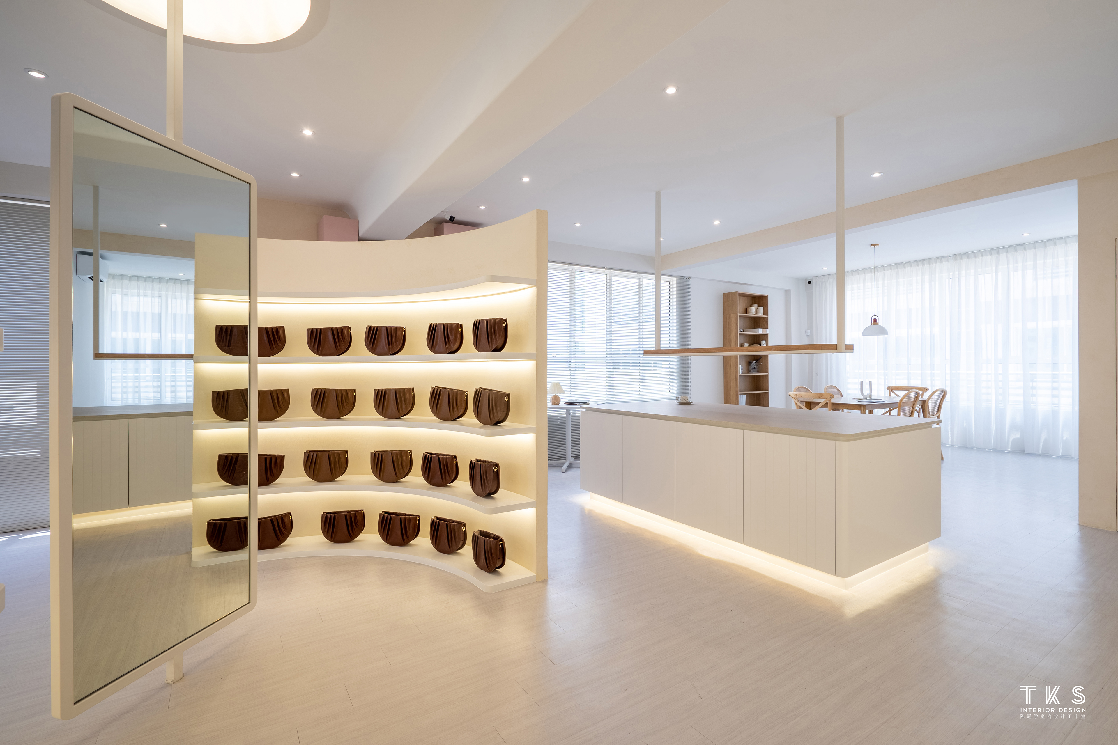 双面镜子可以照出不同的场景,一面可以照招牌区,另一面可以照摄影区和TOGO沙发的氛围,旁边的弧形展示架放包和配件让客户可以在这里拍照和打卡。靠墙的展示架放摄影的摆设品,方便在摄影区做产品拍摄。在摄影区也是休闲区,配搭TOGO沙发可以放松也可以当作拍摄场景。