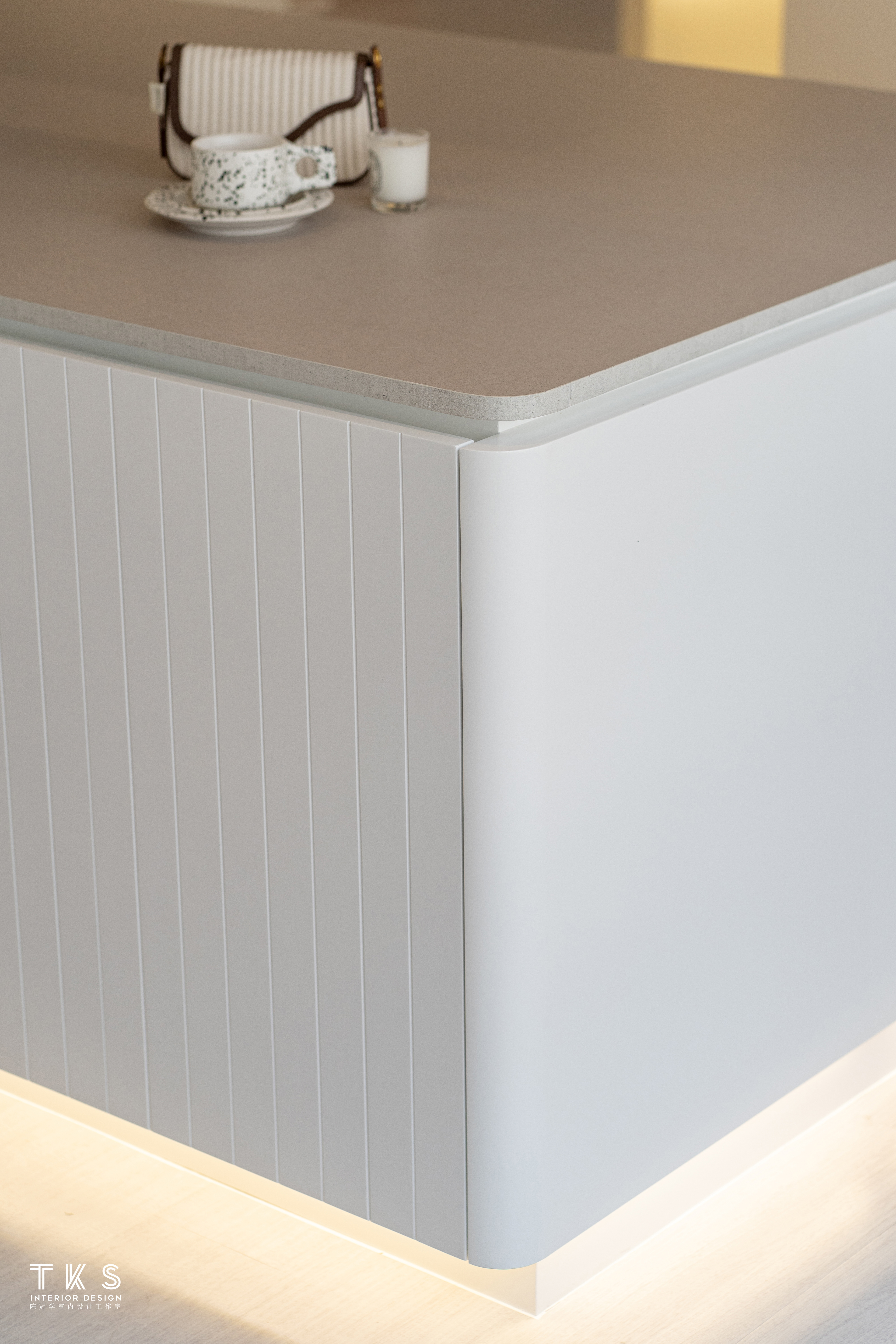 这空间设计分成工作区,展示区,摄影休闲区,和储存室。展示区分别有中岛区在进门可以展示这品牌的配件 ,客户可以先了解这包的实用性和特色。中岛台面使用层压板灰色水泥色纹路,台面边角和侧板弧形化,门面是实用白色喷漆和打V凹槽线条,让这中岛看起来极简和精致的线条 ,而里面可以收纳。
